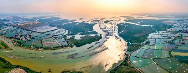 梁杰《运河沿岸》。2022年10月29日,钦州市钦南区,平陆运河沿着钦江流经钦州市后汇入北部湾。图为入海口的红树林、蚝排和海水养殖场
