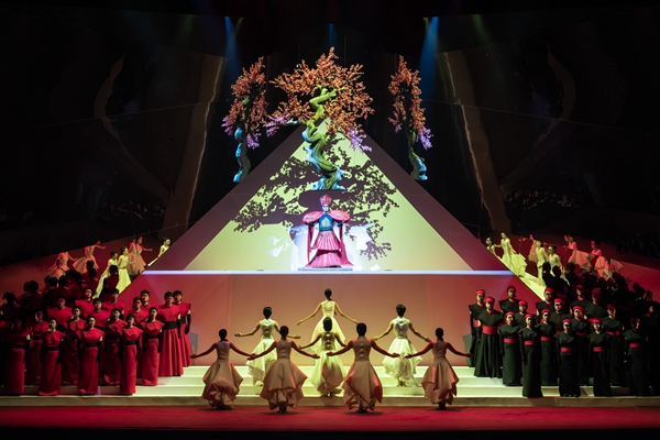 在音乐语言上,作曲家宝玉进行了大胆探索,力求将史诗的广度、戏剧的深度和情感的温度融入创作之中。他表示:“刚柔相济,灾难的震撼才更有冲击力;人物的悲壮与柔情交织,才能让观众产生真正的共鸣。”在舞台呈现方面,导演易立明选择抽象化、象征性的表现方式,使舞台超越具体历史时空,呈现出原始神话的力量。易立明说:“民族元素必须经过转化,才能用世界都能理解的艺术语言讲述我们的故事。”