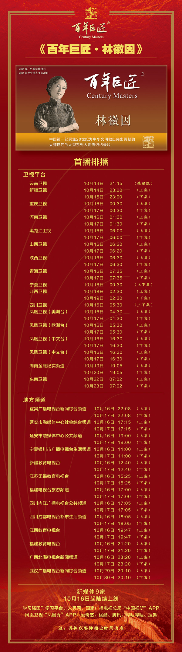 据悉,此次活动由宜宾市翠屏区人民政府、宜宾李庄古镇景区管委会、《百年巨匠》摄制组承办,贝壳集团、北京链家赞助支持。《百年巨匠-林徽因》同时是北京市广电局扶持项目、北京大视听重点文艺项目,近日在凤凰卫视、四川卫视、黑龙江卫视、重庆卫视、河南卫视、宁夏卫视、山西卫视、陕西卫视、青海卫视、江西卫视等地方频道,“学习强国”学习平台、人民网、国家广播电视总局“中国视听”APP、凤凰卫视“凤凰秀”APP、爱奇艺、优酷、腾讯、哔哩哔哩、搜狐等新媒体平台首播。
