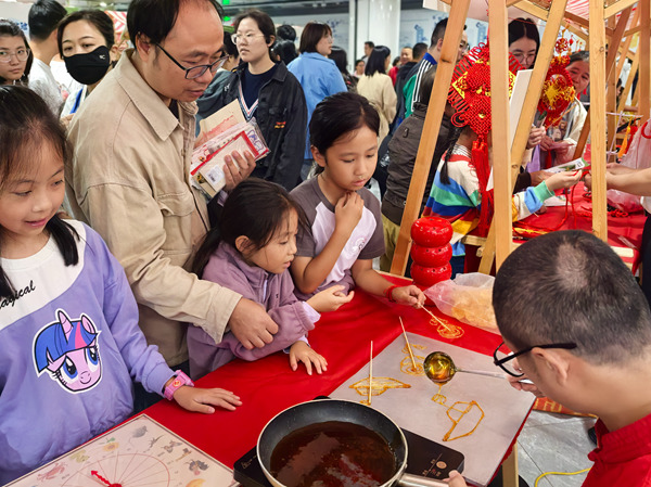 非遗体验区人气爆棚,制香摊位前,读者们学习调配香料。剪纸、面塑、绳结、葫芦画、雕版印刷、榫卯结构等区域,读者们专注地跟着老师学习。红纸剪出灵动图案、面团捏出鲜活造型、彩绳编就传统挂件、木条拼成精巧模型,最热闹的糖画摊位,老师手中的糖浆蜿蜒流转,转瞬就凝成栩栩如生的小动物。