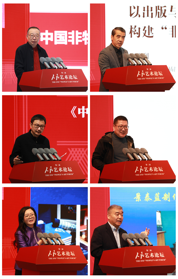 第二届人民艺术论坛主旨演讲环节,来自全国文艺与非遗领域的专家学者围绕“非遗融入现代生活”主题进行演讲,从不同学科视角阐释非遗保护与创新发展的多维路径。潘鲁生以《中国非物质文化遗产保护的基本原则》为题,从四个方面系统梳理了非遗保护工作的理念框架与实践经验;田忠利以《以出版与设计之力,构建“非遗活化”的创新生态》为题,从出版美学出发,探讨出版设计在推动非遗传播中的转化作用;许锐以《中国传统民族民间舞蹈的当代转化》为题,分享了表演艺术类非遗的创新路径;杭间以《“非遗”与当代创新》为题,从学术角度深入分析了非遗在保护传承中“守正”与“创新”的关系;依文集团董事长夏华以《释放民族文化原力,让世界看见中国文化之美》为题,展示了非遗在产业振兴与国际传播中的现实意义;中国工艺美术大师、国家级非物质文化遗产景泰蓝制作技艺代表性传承人钟连盛以《景泰蓝艺术的当代创新应用》为题,分享了景泰蓝的制作工序、发展历史以及传统技艺的转型实践成果。专家的演讲共同勾勒出非物质文化遗产在当代从“固本”到“求新”,再到“赋能”的清晰发展蓝图。主旨演讲环节由张淳主持。