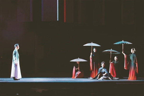 导演李伯男有意识地探索、实践、表现东方美学意蕴,舞台呈现在现实主义基础上进一步突破,追求具有风格化的舞台意象和人物造型。在黑与白的基调中,以服装色彩、舞台灯光点缀灰与暗红,充分表现令人荡气回肠的前尘旧梦。舞台布景以简洁的几何线条、框架结构,构成多层次、区隔化的表演场景,穿着白、黑、灰色调服装的剧中人盘桓其中,生命与魂灵、此生与往世相依、相克、相生,繁漪舍弃了标志性的华丽却沉郁的旗袍,四凤也没穿纺绸衣衫。观众触目所及,宛如黄昏独立时看到他们投向地平线的幽暗身影,又如午夜梦回时抹不去的梦魇之形。导演通过灯光、走位和唱腔引导,将废墟般的周公馆与前尘旧梦并置,让周家客厅与鲁家小屋自由转换,将线性叙事与艺术表达的写意性有机结合,实现了从写实悲剧到诗化意境的转化。剧中,雷雨既是自然现象,也是情感爆发的隐喻,这一意象贯穿始终。唱词反复渲染“高天上雷雨在酝酿宣泄”,雷声和断电效果交织,撕裂黑暗天际的闪电的强光炸裂,将自然界与人心的“风暴”融在一起。