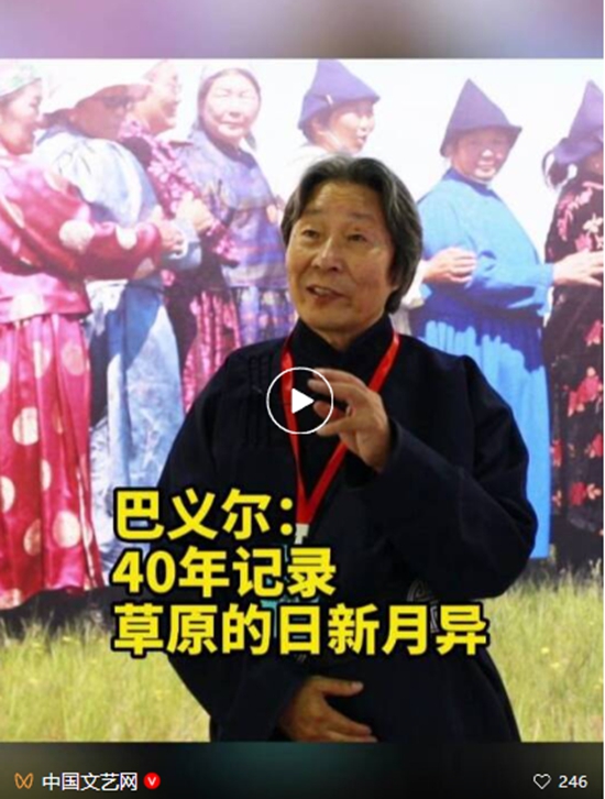 《草原故事》位于展厅中间位置,作者巴义尔身着蒙古族长袍介绍创作故事,吸引了众多观众观看合影。巴义尔从上世纪80年代就开始拍摄内蒙古题材,入选的这组图片展现了2000年以来北方草原经历的华丽转身——传统游牧与现代技术融合,牧民生活富足,民族团结如磐,“绿水青山”理念深入人心,千年游牧文明在新时代焕发新生机。他指着其中一幅作品介绍,“房车”代替了蒙古包,里面有床、电视、煤气灶,随走随住很方便。另外一幅表现的是牧民们在那达慕音乐晚会上自发组织演出,反映了牧民们的精神生活也更加富足。