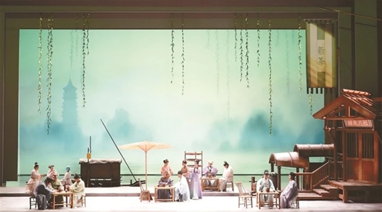 剧中“斗茶”场景凸显音乐戏剧的魅力。当赵盼儿与茶汤巷掌柜比试点茶技艺,琵琶轮指被用来模拟茶筅击拂的节奏,弦乐组以跳弓技法表现茶沫升腾的动态。与此同时,多位舞者身着渐变绿纱衣,水袖翻飞间似茶汤旋舞,多媒体投影将茶沫幻化为漫天星辰。宋代茶艺、舞蹈、多媒体和交响乐熔铸一炉,让传统的点茶技艺焕发出当代的新意味。正如该剧总制作,上海歌剧院党委副书记、副院长张庆新所说:“我们以国风为韵脚,以歌剧为诗行。《梦华录》的创作不是表象化的符号叠加,而是让古筝、琵琶与提琴对话、让宋词与宣叙调共生。这种融合的艺术,正是中华美学在世界艺术语系中的自信表达。”