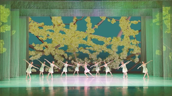 在春之篇章中,舞台视觉以水墨写意动画开篇,俯视解冻的黑龙江,冰排崩裂,水滴落下,唤醒如种子般萌发的舞者,象征生命力量觉醒。受吴冠中线条美学启发,光秃的枝条演变为满园绿意,核心视觉符号——银杏老树的投影随之出现,从枯枝到开花,与花环秋千共构青春的隐喻。篇章高潮以丁香花海的延时绽放动画呈现,繁花自然过渡为索菲亚大教堂、哈尔滨大剧院等城市地标,寓示自然与城市共同苏醒。教堂前的路灯与独舞者相依,将人文情感注入视觉系统,完整表达了“萌动与新生”的主题。