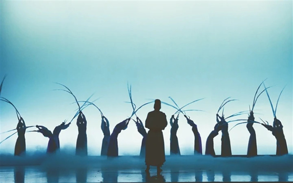 颜真卿从上场门一侧步入眼前的现实中,在有声无语的哼鸣中,在如雾如烟的熹微中展开了表达自己心志与血性的舞蹈……在心志与血性的表达中,颜真卿最铭心刻骨的便是侄儿季明——舞台后区出现了手持习书之笔的侄儿季明,宛如浊世的一股清流来到身旁;颜真卿在与之共舞间接过侄儿手中之笔,而这其实是他在取笔之际思之愈深的心象外化。悲情愤书而致的枯笔、破锋间,巨幅的《祭侄文稿》自天棚而降——这篇由情感驱动的笔墨,节奏随情绪起伏,因极度悲愤而进入书法的“忘我”之境,无意而为却以厚拙、灵动的线条开创了雄强豪迈的盛唐气象……颜真卿捧起案几上的侄儿首榇,向舞台深处、也是向历史深处踱步而去。一众肩背插翎、双手持翎的舞者,将雉翎如“靠旗”般舞动,俨然《祭侄文稿》的悲愤之气、雄秀之风溢出书帖而浸漫乾坤,乐音中的哼鸣之声也由此愈发高亢,向着云天九霄喷薄升腾!哼鸣之声转向如泣如诉的二胡弦音,在弦音与乐队的和鸣中,一名舞者背负硕大的石碑从颜真卿远去处而出,更多背负硕大石碑的舞者由上场门一侧向下场门方向迤逦而行;安顿好侄儿首榇的颜真卿携一众“靠旗”般舞动雉翎的舞者,融入弧形相衬的石碑林立之间,在负碑舞者坚毅、沉郁的逆时针旋动中,实现着血性与墨迹、人格与书风的熔铸统合。舞台光区渐渐压暗,依稀可见的是颜真卿伟岸的背影——背投光中出现愈来愈多受追思、追随颜真卿的来者,诵读着《颜氏家训》的训言:“行诚孝而见贼,履仁义而得罪;丧身以全家,泯躯而济国。君子不咎也!”来者不断诵读、不断前行,由此而以“君子不咎也”推向高潮。笔者此时真是感慨主创们的洞见:他们由颜真卿《祭侄文稿》开篇,追溯到其祖先北齐文学家颜之推的《颜氏家训》,通过这一“颜氏文化”并峙高耸的双峰,申说中华优秀传统文化中“家国一体”的观念。尾声《墨尽》的字幕此时显现:“青灯燃尽,墨痕未干,颜氏家训振聋发聩。待东方既白,再赴征程,这一程定不负颜氏,不负家国,不负苍生!”仍然是贯通全剧的哼鸣声起,《祭侄文稿》由投影覆盖整个天幕,从“学堂授业”到“祭侄传道”,从克制隐忍到悲歌慷慨,舞剧将颜氏一族的家国情怀呈现得淋漓尽致,更将颜真卿忠正耿直的血性墨迹传达得无以复加。舞台纱幕犹如悠远的历史深处,一身血色袍服的颜真卿缓缓回身,在《祭侄文稿》的映衬下以身为模、以字为范,让无数后来者体验着“一笔一脊梁,一字一山河”,体验那份穿越千年的深沉激荡!