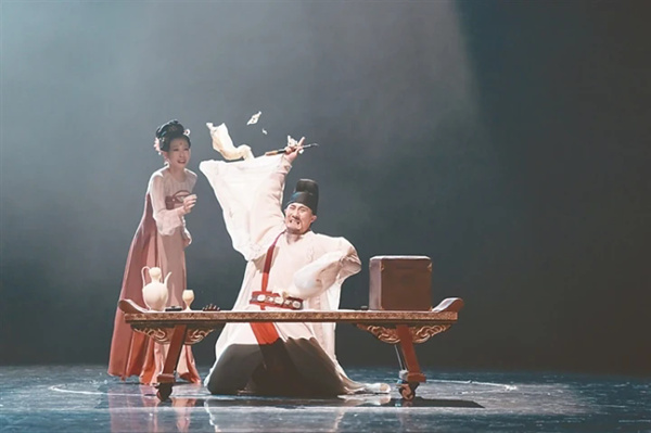 沉郁的乐音缓缓流淌,悲怆的哼鸣在乐音中跌宕。舞台后区中线处定位光下,首先亮相了一位身着白袍的中年男子,伟岸的身躯庄重地衬托着他怀抱着的一只木匣。切光后,上场门一侧的定位光亮起,光区内只见一个体态“臃肿”者被4人肩扛臂揽。又一次切光后,定位光在下场门一侧亮起,一个双手各持一把新月式弯刀者在光区内“鼠眼贼眉”,虽然并没有字幕来“贴标签”,但观众都能意识到后两人分别是奢靡腌臜、结党营私、争权夺利的奸相和暗藏祸心、野心勃勃、叛乱谋反的贼臣,剧中就称为“相”与“贼”。对表颜真卿所置身的历史,“相”即李林甫、杨国忠和卢杞的综合体,而“贼”则是安禄山。舞台灯光微微明朗起来,白袍男子右侧身后闪过一位白衣秀士,这当然是男主角颜真卿和他的侄子颜季明。颜季明在剧中被称为“侄”。在侄隐去后,一位女子从颜真卿左侧步出,这当然就是颜妻韦氏了,剧中称为“妻”。妻随着怀抱木匣的颜真卿来到台中的案几前,将木匣放置案几后微微开启探视,又痛心疾首地将其合上。笔者想起此前对“序·润墨”的字幕投影写道:“颜真卿接侄儿首榇,执颤抖之笔,为忠魂书祭文。”所谓“首榇”,就是安放头颅的棺盒。面对棺盒,妻为颜真卿斟上一杯酒,他将酒向天挥洒;再斟上一杯酒,他将酒洒向案几前;当妻子又一次将酒杯斟满,颜真卿举杯恭敬于“首榇”,一饮而尽,然后操笔润墨。笔者知道,颜真卿肆意挥洒的是“以清酌庶羞,祭于亡侄赠赞善大夫季明之灵”的《祭侄文稿》,是那种“携尔首榇,及兹同还。抚念摧切,震悼心颜”的悲怆心绪与悲愤胸臆。