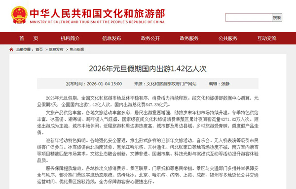 今年元旦假期,全国文旅市场交出亮眼“开门红”答卷。据文化和旅游部数据中心测算,3天假期内,全国国内出游人次1.42亿,国内出游总花费847.89亿元。各地跳出“单一赏景”的传统模式,以丰富多元的文旅活动为抓手,打造兼具沉浸式体验与情感共鸣的消费场景,为广大游客奉上了一场场融合视觉享受与心灵滋养的文旅盛宴。