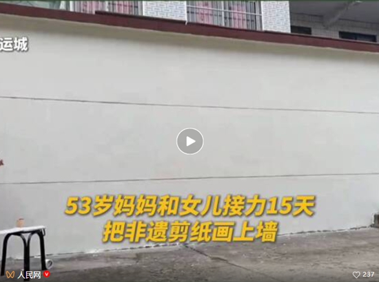 牛郎织女的鹊桥相会在指尖纹样中流转,福禄寿喜的吉祥符号随光影跃动,极具地域特色的山水轮廓与人文印记藏于其间……近日,一条以创意剪纸为主题的短视频引发关注——53岁的山西省运城市垣曲县剪纸非遗传承人刘芸,与学油画的“90后”女儿段弈帆携手,用15天时间完成了一幅剪纸墙绘,让剪纸艺术真正“跃”上墙面,化作一道看得见历史、触得到文脉的文化风景。有网友评论:“一剪一画间,时光在墙上开出非遗最美的花。”
