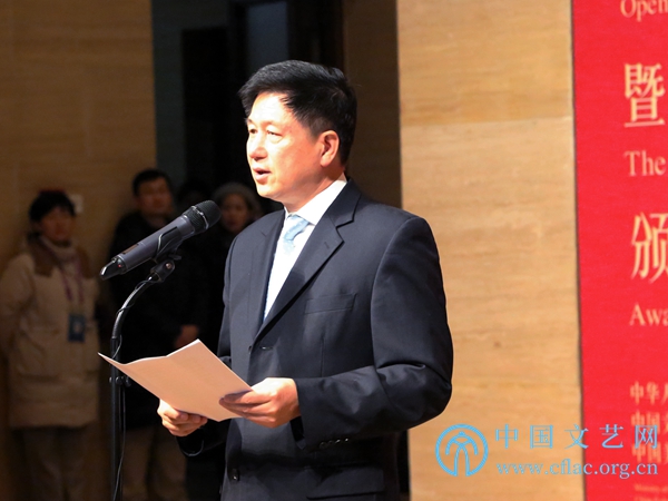 12月20日,第十三届全国美展进京作品展开幕式暨第三届中国美术奖颁奖仪式在京举行,图为中国美协分党组书记、驻会副主席徐里主持开幕式。中国文艺网 韩雪竹摄