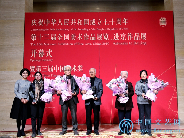 12月20日,第十三届全国美展进京作品展开幕式暨第三届中国美术奖颁奖仪式在京举行,图为中国文联主席、中国作协主席铁凝为周令钊、全山石、常沙娜、刘文西、靳尚谊五位获得“中国文联终身成就美术家”的老艺术家或家属颁发奖杯。中国文艺网 韩雪竹摄