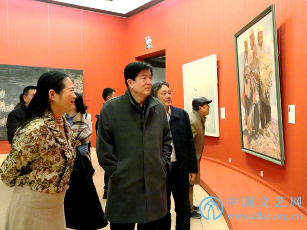 12月20日,第十三届全国美展进京作品展开幕式暨第三届中国美术奖颁奖仪式在京举行,图为中国文联党组书记、副主席李屹,中国美协分党组副书记陶勤,中国美协秘书长马锋辉等参观展览。中国文艺网 高森摄