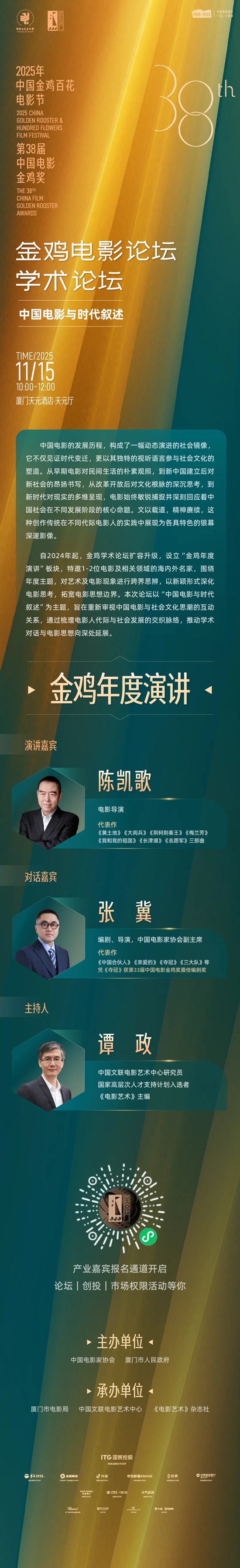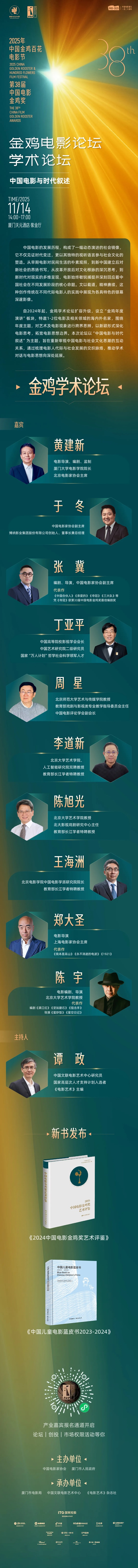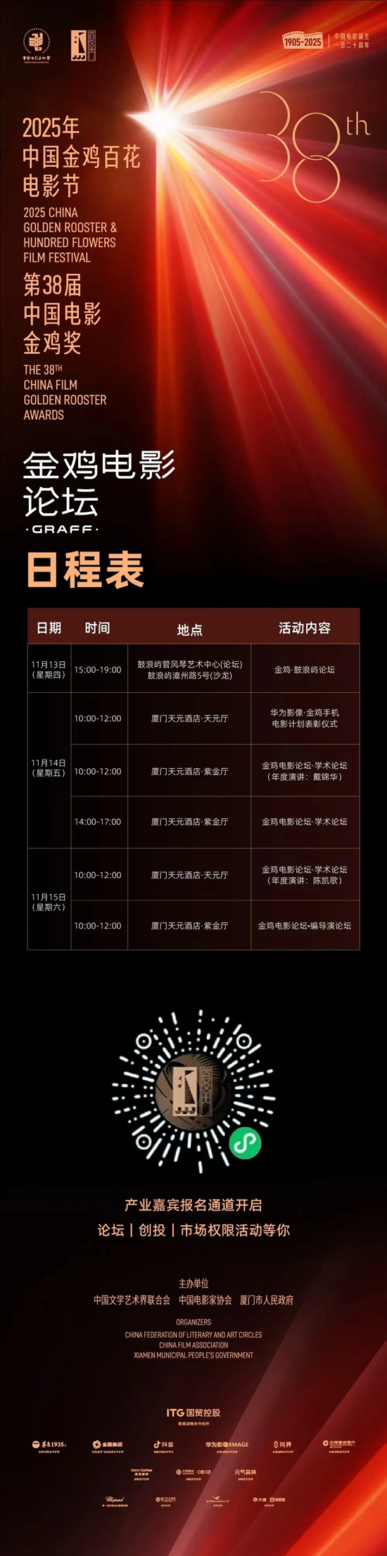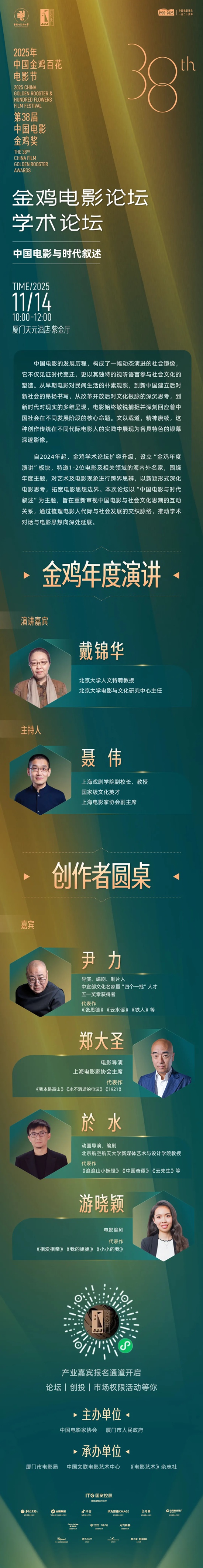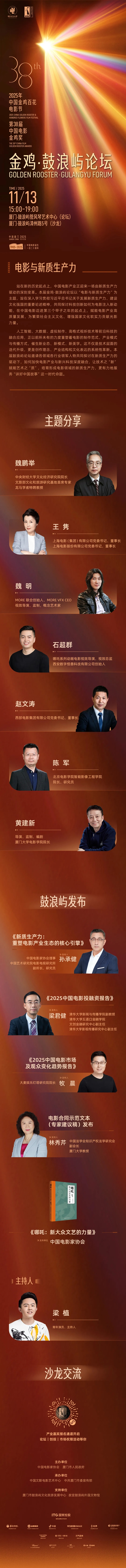 2025年是中国电影诞生120周年,是电影“十四五”规划目标任务的收官之年,在习近平文化思想的指导下,在学习贯彻习近平总书记给田华等8位电影艺术家重要回信精神的背景下,本届金鸡电影论坛落实党中央关于电影工作的决策部署,持续关注电影发展趋势,精心策划了金鸡·鼓浪屿论坛、学术论坛、编导演论坛等内容丰富、具有行业影响力的论坛活动,集中于11月13日至15日在鼓浪屿及厦门天元酒店举办。本届论坛活动从电影创作、产业、学术、编剧、导演、表演、新质生产力等多维度,聚焦“推动电影创作和产业高质量发展,构建现代化电影工业体系”这一目标,邀请行业有影响力的电影人物展开深度对话,探讨中国电影热点话题与发展机遇,引领电影创作更加精准有力地描绘场景里的新时代,为“十五五”期间中国电影发展关键一跃和2035年实现建成电影强国的战略目标凝聚力量。