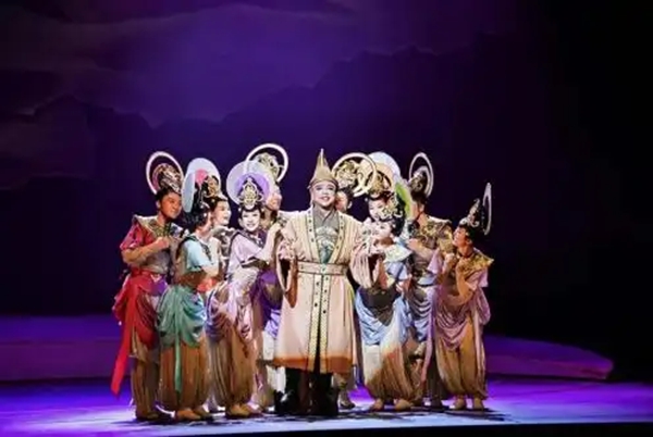 剧中,一位燃臂指路的萨宝,在灯光的照映下,带领粟特商队走在月牙沙丘之上,驼铃声伴着风沙在空中慢慢回荡;米薇在神祇的帮助下,那守护女儿、躲避凶险、寻找丈夫的身影与昔日商队往来、文化交流的盛景一一浮现眼前。多媒体技术还原了沙暴、市集、洞窟的奇幻场景;旋转舞台的裸眼3D效果与纱幕投影交织,仿佛承载着时光的流转,将科技与传统美学完美融合;服装造型结合了魏晋风格与多民族元素;现代化布景一次次随剧情流转,合唱与群舞叠合,货物与人流同频,观众仿佛穿越了时空,置身于那条连接东西的文明走廊,亲身经历了一场跨越时空的情感之旅。那段千年的丝路情缘,借当代艺术语言深情绽放,深深触动了每一位现场观众的心弦。